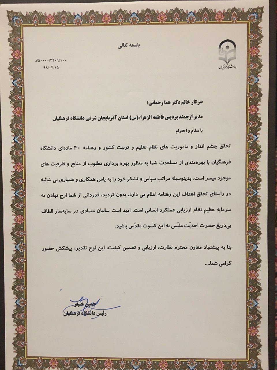 تجلیل از مدیریت دانشگاه فرهنگیان آذربایجان شرقی به عنوان استان حائز رتبه نخست