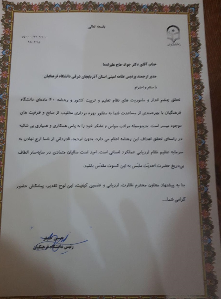 در این راستا از تلاش های صورت گرفته دکتر اسداله خدیوی مدیر امور پردیس های دانشگاه فرهنگیان آذربایجان شرقی، دکتر جواد حاجی علیزاده سرپرست پردیس علامه امینی(رض) و سرکار خانم دکتر هما رحمانی سرپرست پردیس فاطمه الزهرا(س) تبریز، با اهدا لوح سپاس که به امضا ریاست عالی دانشگاه فرهنگیان دکتر حسین خنیفر رسیده بود، تقدیر به عمل آمد.