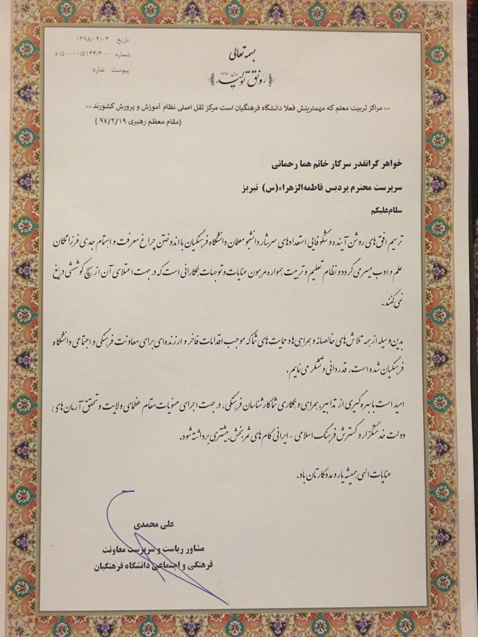 در بخشی از این تقدیرنامه که به امضا دکتر علی محمدی مشاور ریاست و سرپرست معاونت فرهنگی و اجتماعی دانشگاه فرهنگیان رسیده خطاب به سرکار خانم دکتر هما رحمانی سرپرست پردیس فاطمه الزهرا(س) تبریزآمده است: