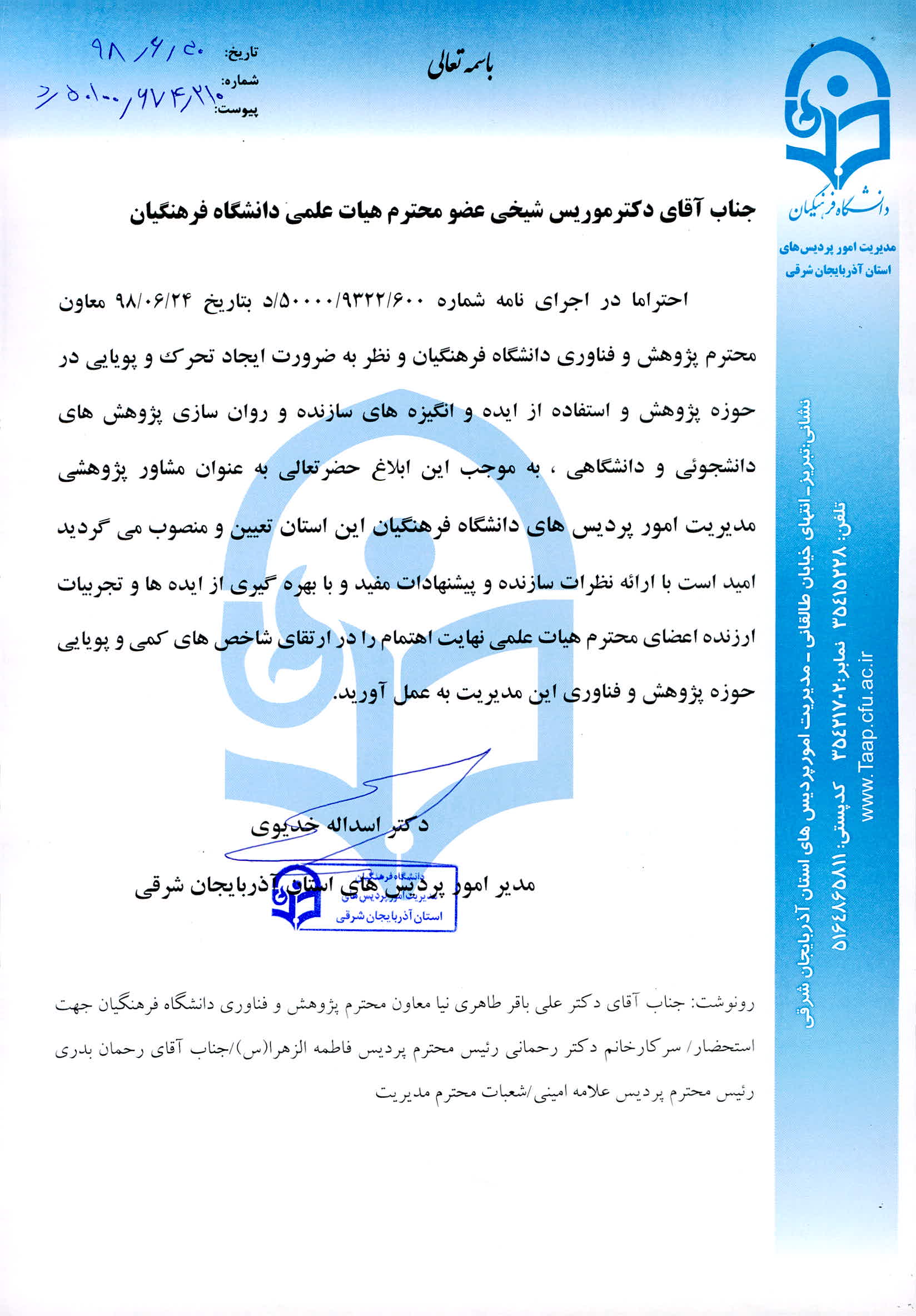 نظر به ضرورت ایجاد تحرک و پویایی در حوزه پژوهش و استفاده از ایده و انگیزه های سازنده و روان سازی پژوهش های دانشجویی و دانشگاهی ، به موجب این ابلاغ حضرتعالی به عنوان مشاور پژوهشی مدیریت امور پردیس های دانشگاه فرهنگیان این استان تعیین و منصوب می گردید.