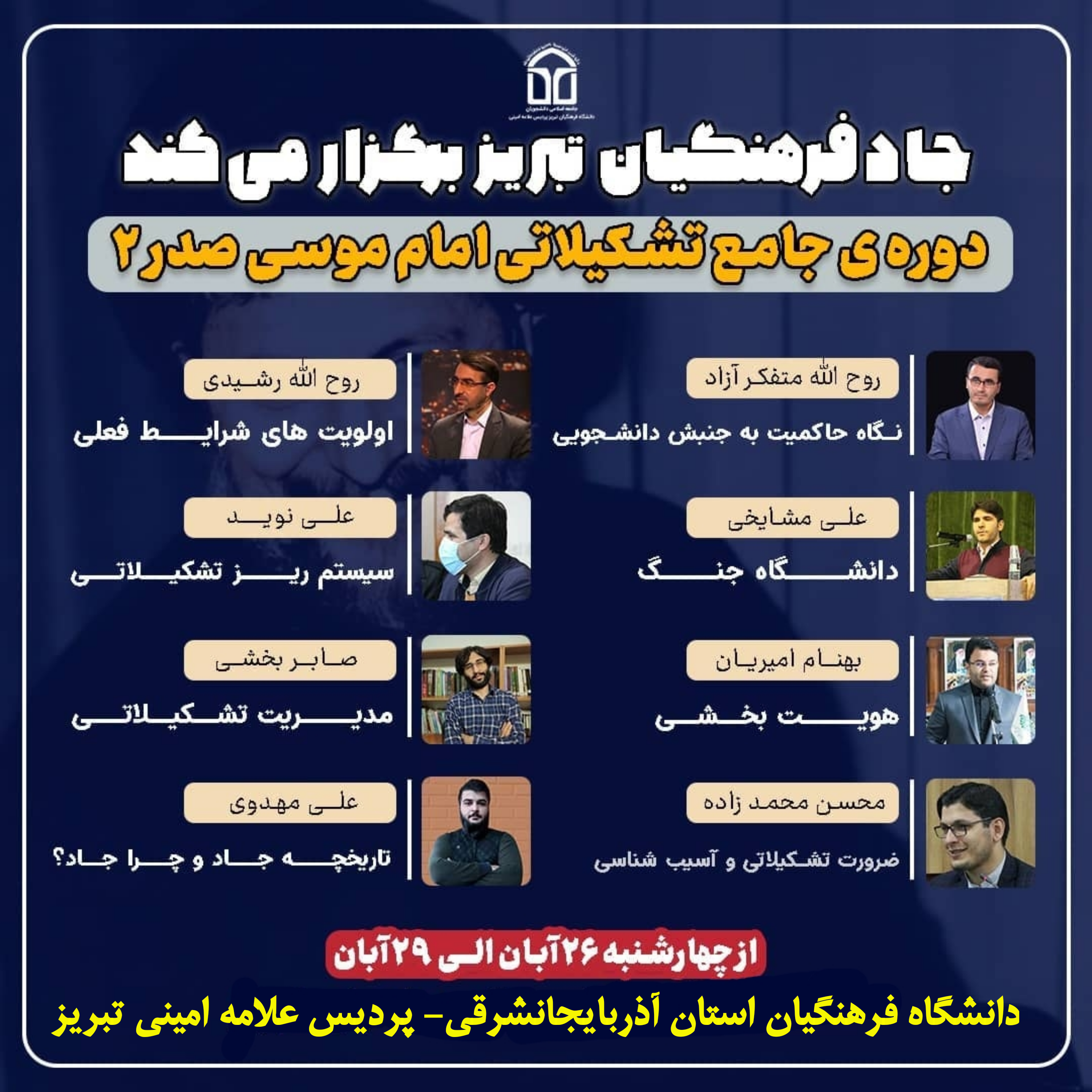 به گزارش روابط عمومی دانشگاه فرهنگیان استان آذربایجانشرقی دوره ی جامع تشکیلاتی امام موسی صدر ۲درپردیس علامه امینی دانشگاه فرهنگیان استان آذربایجانشرقی برگزار می شود این دورهی جامع تشکیلاتی امام موسی صدر ۲، از امروز چهارشنبه ۲۶ آبان، در پردیس علامه امینی تبریز توسط تشکل جامعه اسلامی دانشجویان دانشگاه فرهنگیان پردیس علامه امینی تبریز تا شنبه ۲۹ آبان به مدت چهار روز برگزار میشود.