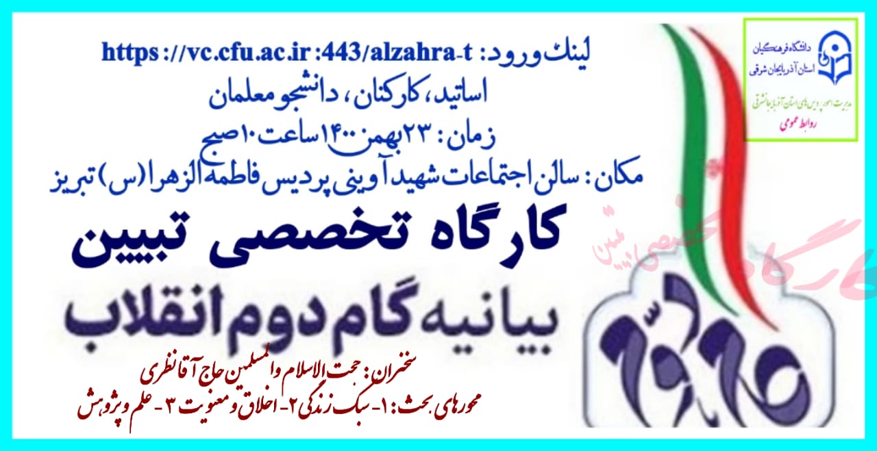 کارگاه تخصصی تبیین بیانیه گام دوم انقلاب اسلامی در محوریت 1- سبک زندگی 2- علم وپژوهش 3- اخلاق ومعنویت در دانشگاه فرهنگیان استان آذربایجان شرقی