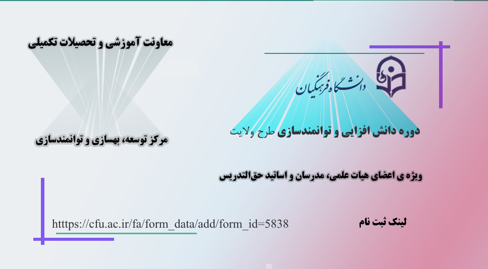 به اطلاع می رساند مرکز توسعه، بهسازی و توانمندسازی دانشگاه در نظر دارد دورۀ دانش افزایی و توانمندسازی با عنوان «طرح ولایت» ویژه اعضای هیات علمی و مدرسان با همکاری وزارت آموزش و پرورش برگزار نماید. اعضای هیات علمی، مدرسان و حقالتدریس می توانند با ورود به لینک زیر در دورههای فوق ثبت نام نمایند. شروع این دوره از تاریخ 28 خرداد ماه به مدت حدود 40 روز در مشهد مقدس خواهد بود.