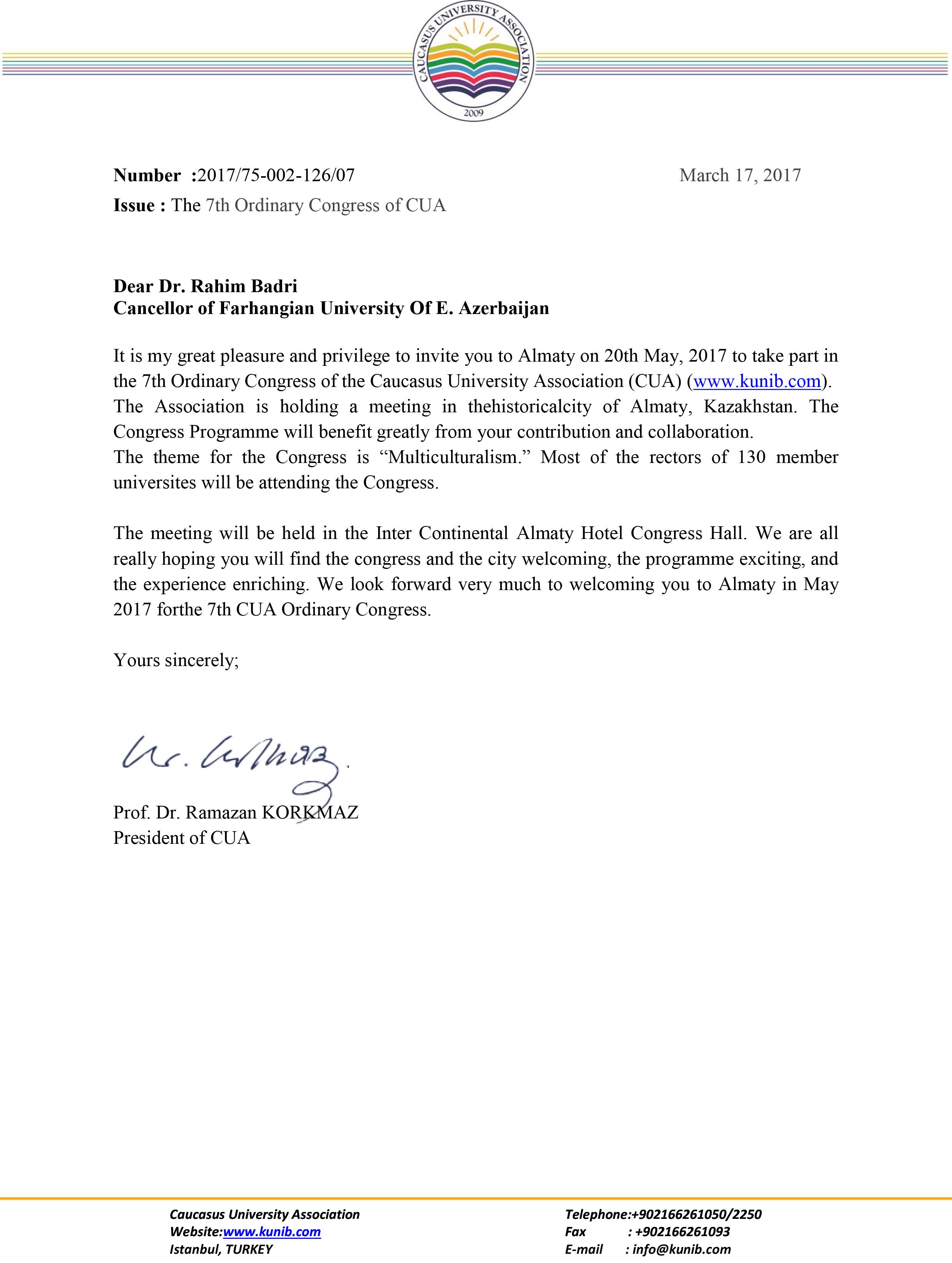 در این گردهمایی که در روز های بیستم الی بیست و یکم ماه مه 2017 در آلماتی قزاقستان برگزار خواهد شد ، روسای دانشگاه های عضو اتحادیه دانشگاههای منطقه قفقاز گرد هم خواهند آمد تا در مورد آخرین تحولات و یافته های علمی در زمینه آموزش چند فرهنگی به بحث و تبادل نظر بپردازند.