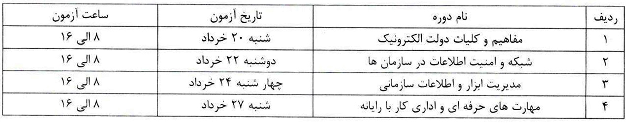به اطلاع همکاران محترمی که در دوره دوم آموزش 52 ساعته فناوری اطلاعات ویژه کارکنان دانشگاه شرکت کرده اند می رساند، آزمون جبرانی سوم مطابق زمانبندی زیر برگزار خواهد شد.