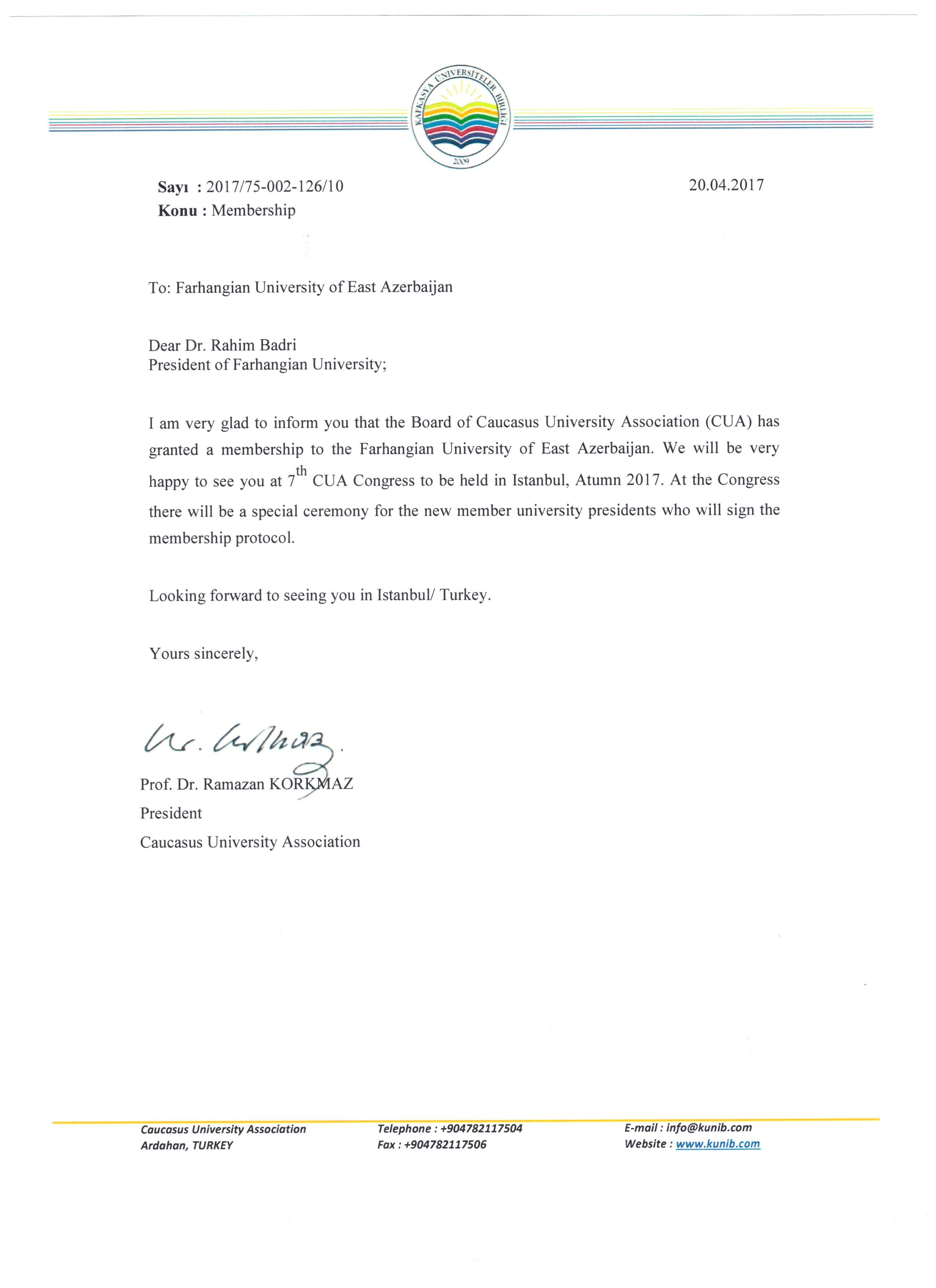 پیرو مکاتباتی که در اسفند ماه سال گذشته صورت گرفت و پس از فراهم شدن مقدمات لازم عضویت دانشگاه فرهنگیان استان آذربایجان شرقی در اتحادیه دانشگاههای منطقه قفقاز(CUA) رقم خورد.