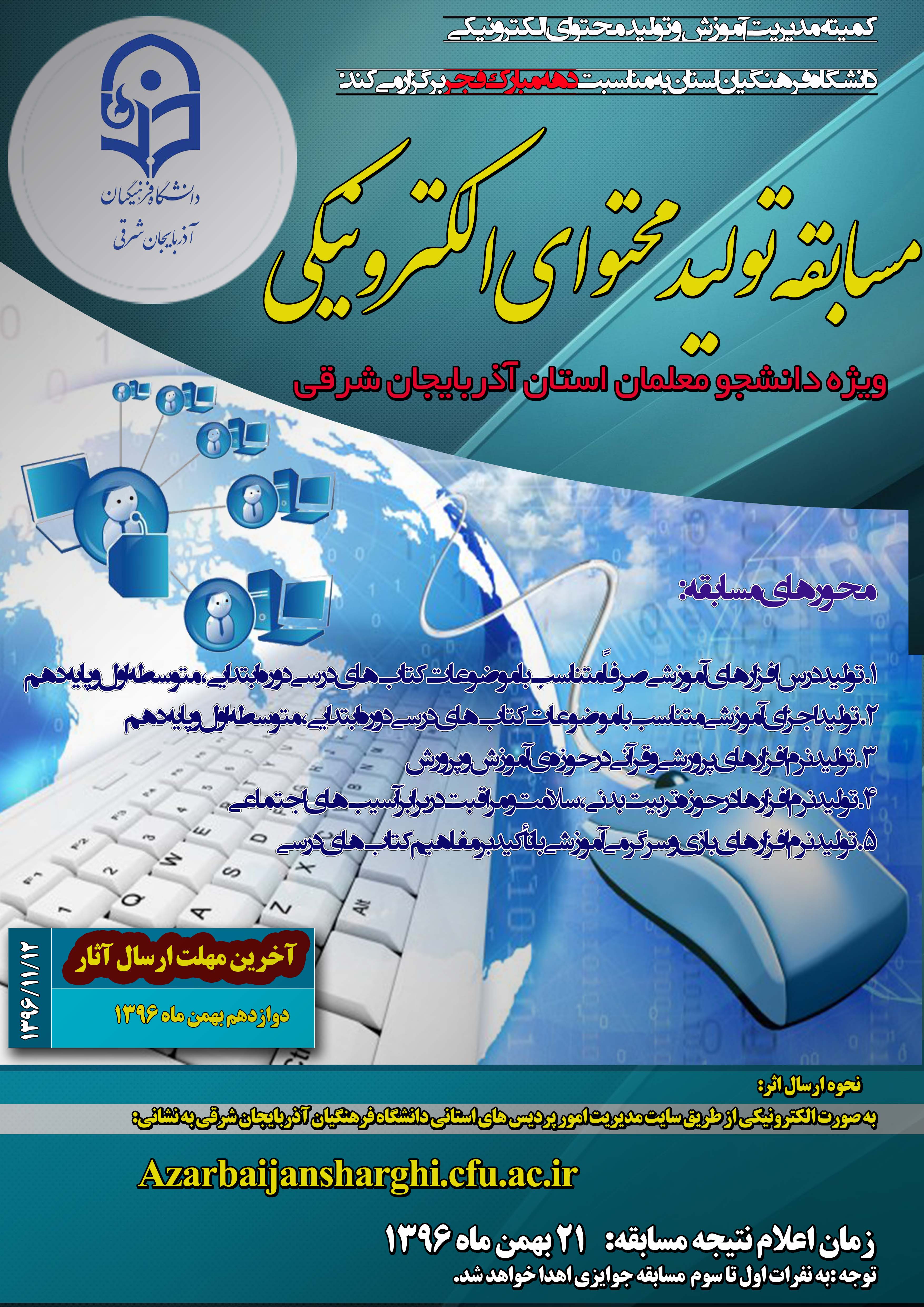 کمیته مدیریت آموزش و تولید محتوای الکترونیکی دانشگاه فرهنگیان استان به مناسبت دهه مبارک فجر مسابقهی تولید محتوای الکترونیکی با محورهای زیر (منطبق برمحورهای جشنواره تولید محتوای الکترونیکی رشد ) ویژه دانشجو معلمان استان برگزار می نماید.