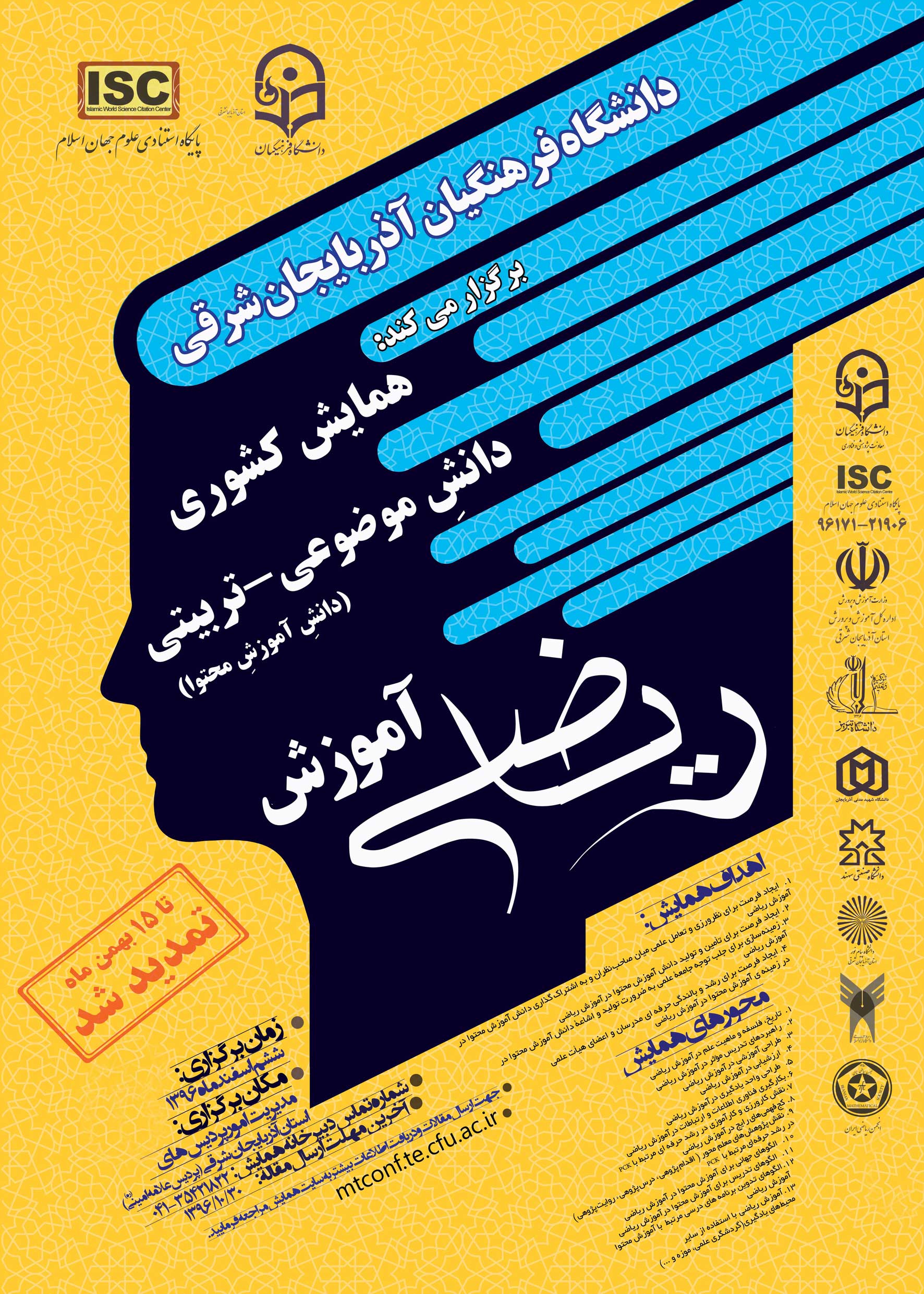 همایش کشوری آموزش ریاضی در اسفند ماه سال جاری به میزبانی پردیس علامه امینی(ره)دانشگاه فرهنگیان آذربایجان شرقی برگزار خواهد شد.