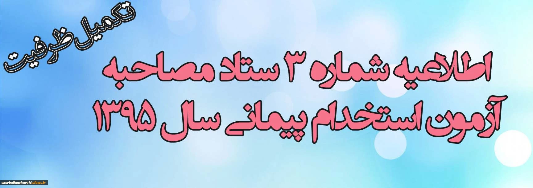 امتیاز دهید : اطلاعیه شماره (3) ستاد مصاحبه آزمون استخدام پیمانی سال 1395 چهارشنبه 4 اسفند 1395 ساعت 17:07