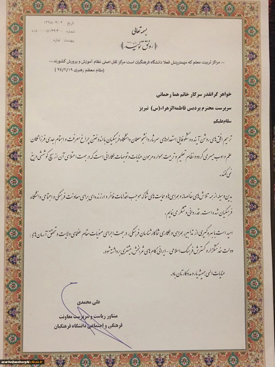 تجلیل از سرپرست پردیس فاطمه الزهرا(س) تبریز به پاس فعالیت های فرهنگی