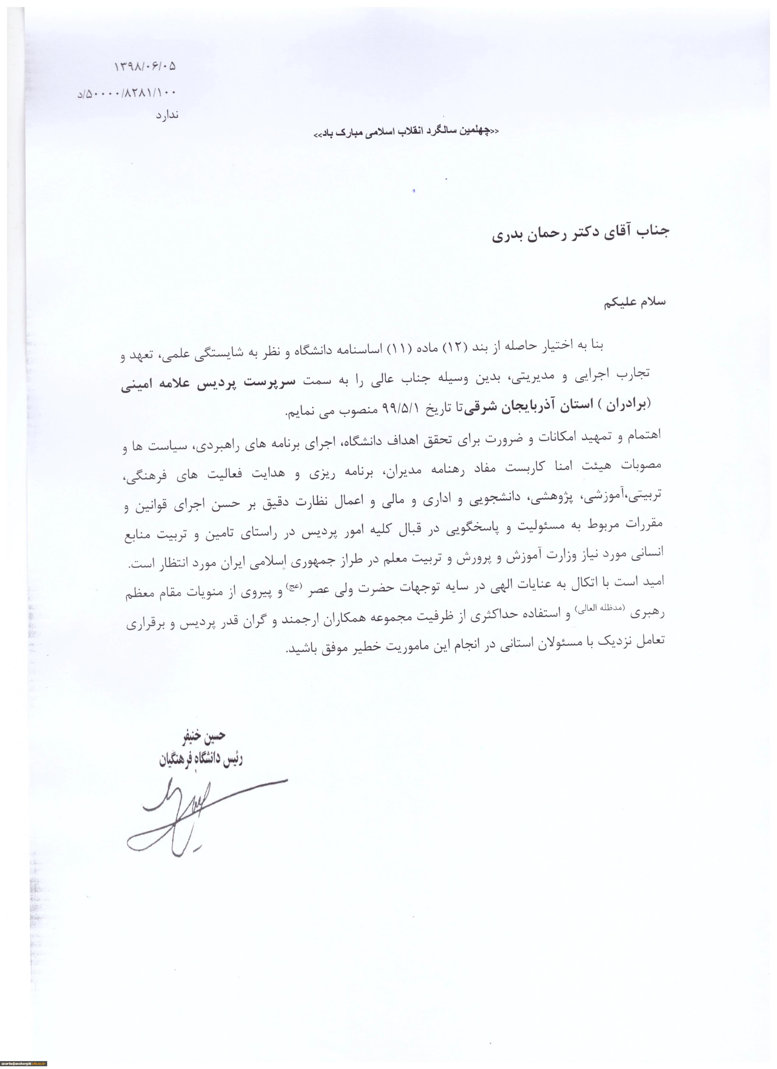 امتیاز دهید : انتصاب دکتر رحمان بدری به عنوان سرپرست جدید پردیس علامه امینی(رض) تبریز سهشنبه 5 شهریور 1398 ساعت 11:21