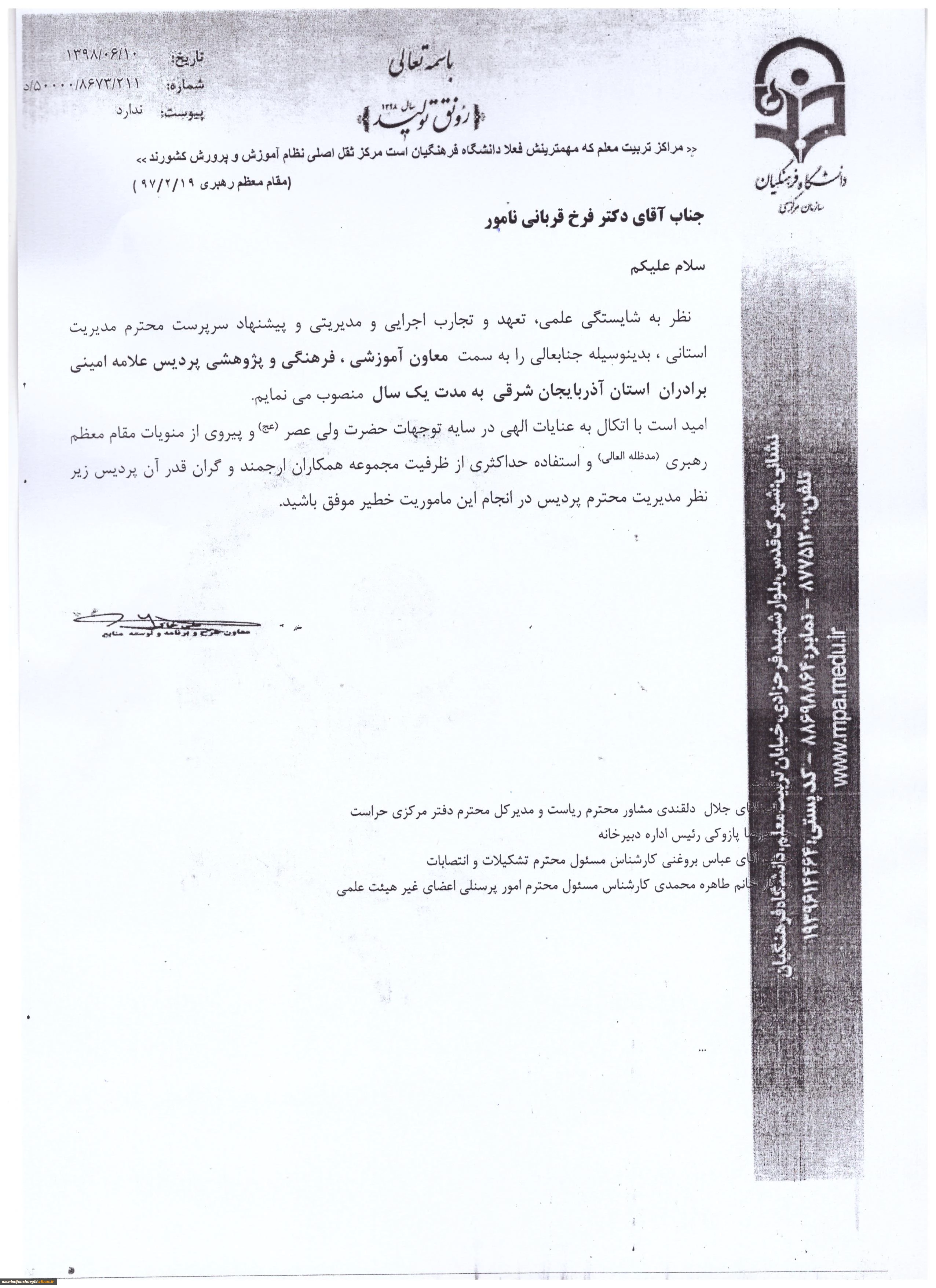 انتصاب دکتر فرخ قربانی به عنوان معاون آموزشی، فرهنگی و پژوهشی پردیس علامه امینی(رض) تبریز