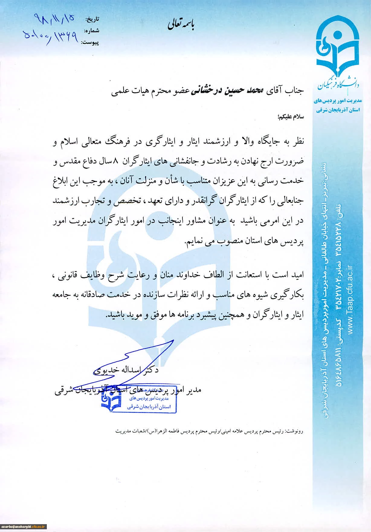 انتصاب دکتر درخشانی به عنوان مشاور مدیریت امور پردیس های استان در امور ایثارگران 3