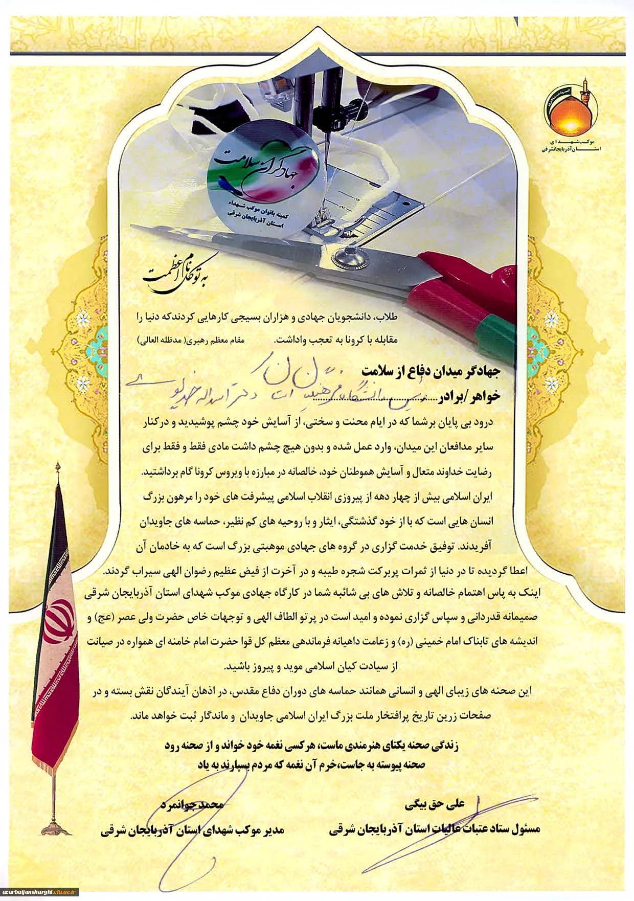 تقدیر از مدیر دانشگاه فرهنگیان استان به مناسبت همکاری در فرایند تولید ماسک و لباس های مخصوص دوران شیوع ویروس کرونا 2