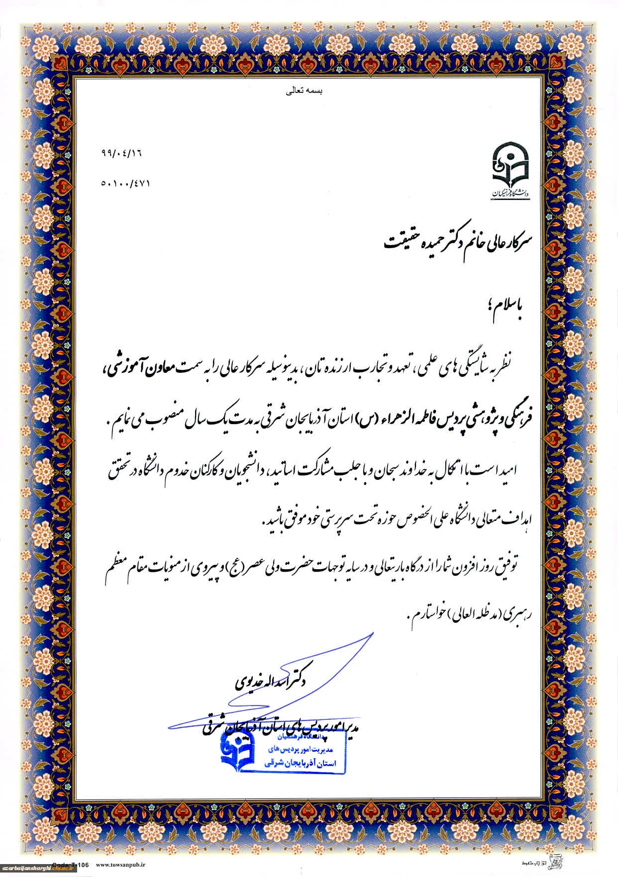 امتیاز دهید : جلسه تکریم و معارفه معاون آموزشی، فرهنگی و پژوهشی پردیس فاطمه الزهرا(س) تبریز 2 سهشنبه 17 تیر 1399 ساعت 12:05