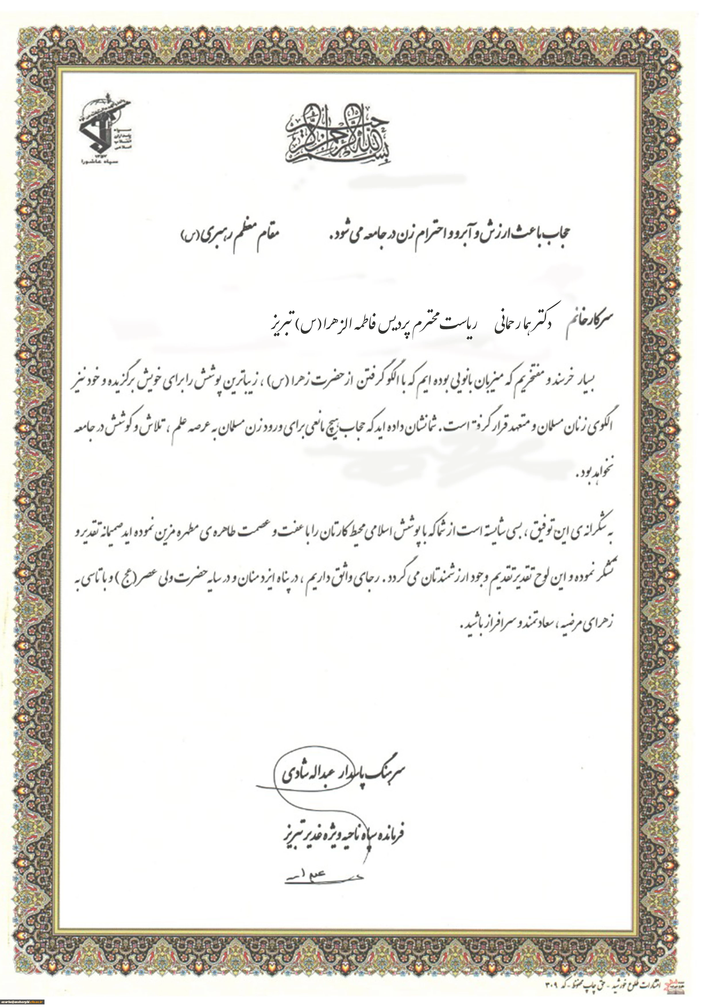تقدیر از ریاست محترم پردیس فاطمه الزهرا (س) تبریز بدلیل داشتن پوشش مناسب اسلامی ایشان 2