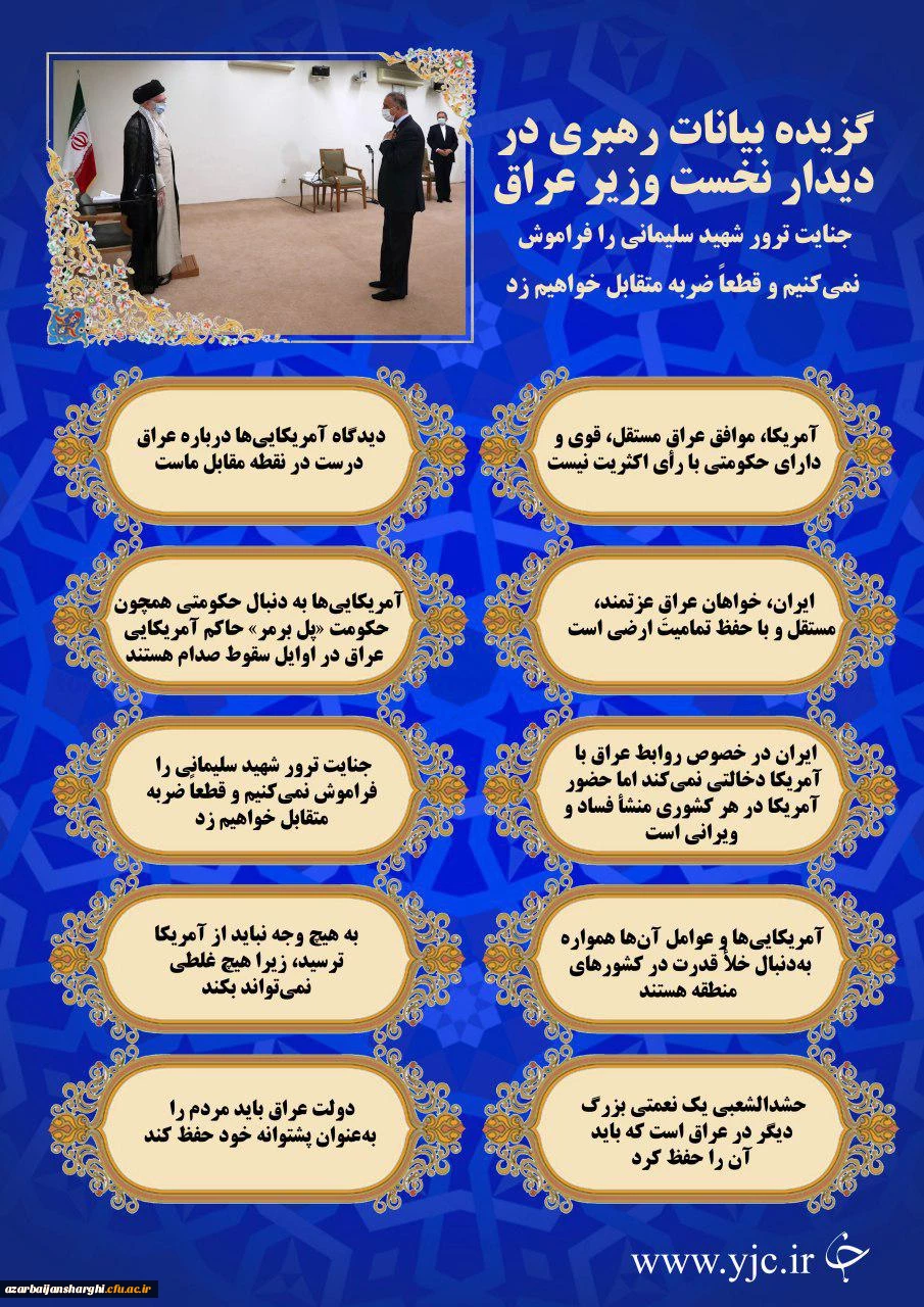امتیاز دهید : برگزیده بیانات رهبر معظم انقلاب در دیدار با نخست وزیر عراق 3 پنجشنبه 2 مرداد 1399 ساعت 18:13