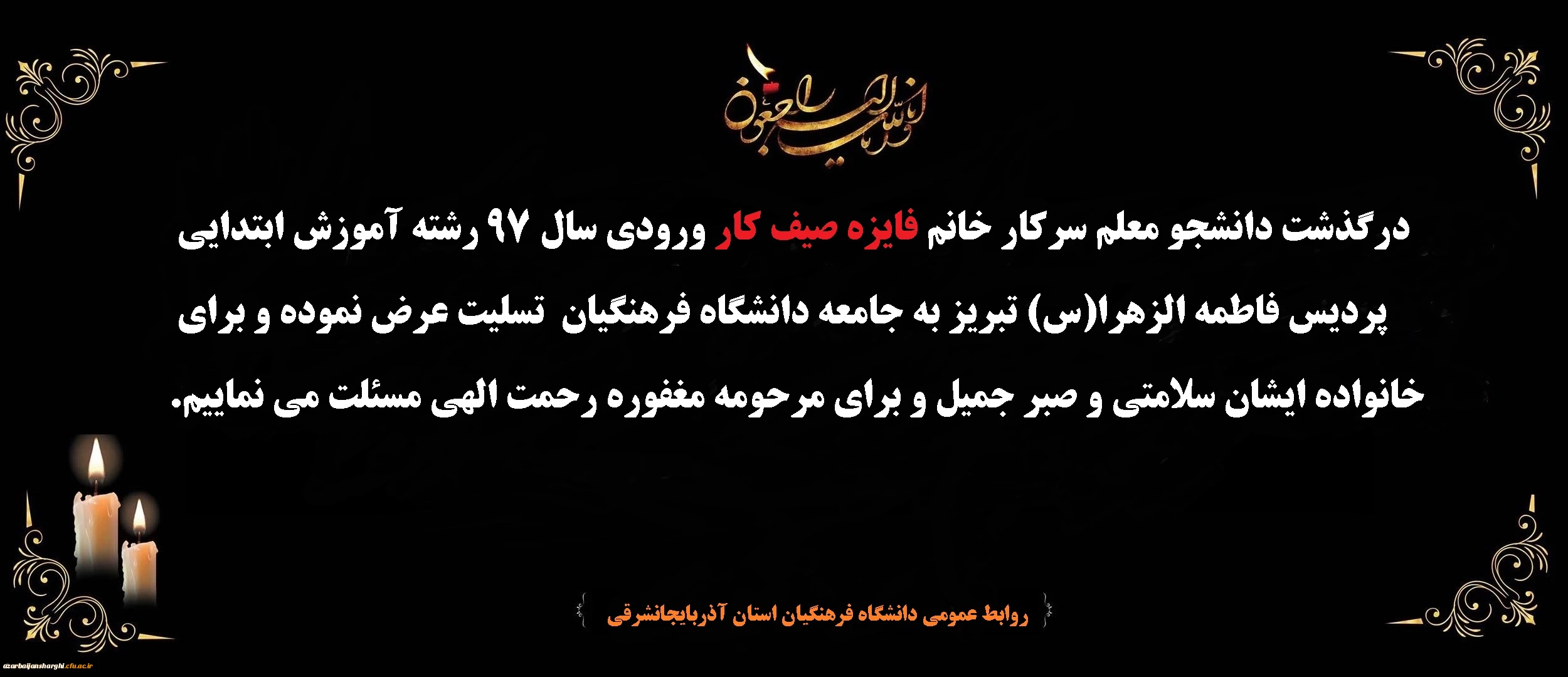 درگذشت دانشجومعلم سرکار خانم فایزه صیف کار ورودی سال97 آموزش ابتدایی پردیس فاطمه الزهرا(س)تبریز تسلیت باد. 2