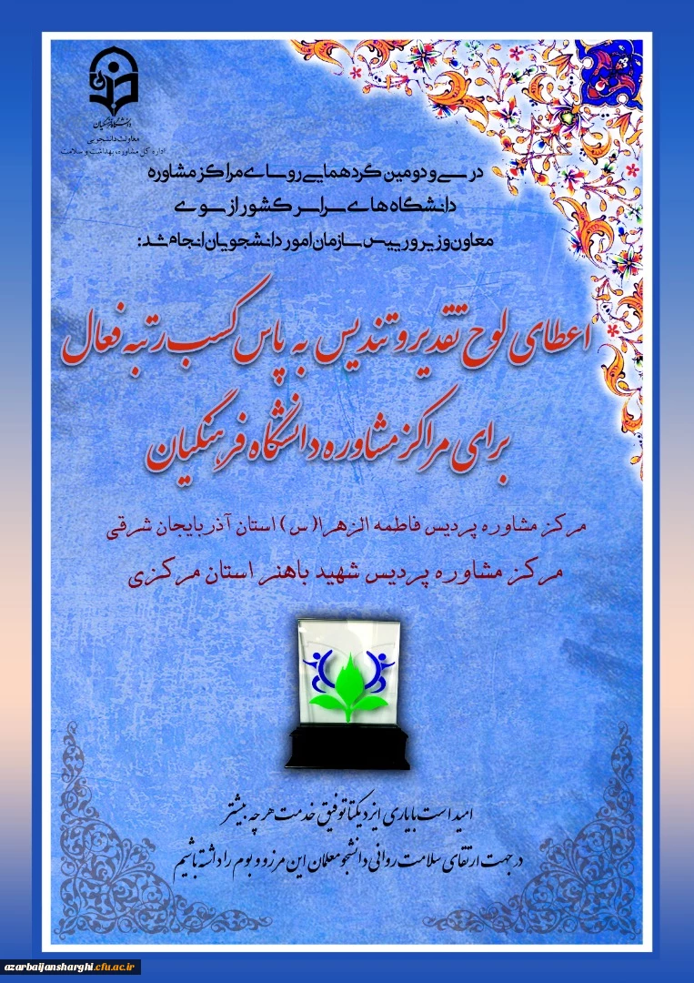 کسب عنوان "مرکز مشاوره برتر" در ارزیابی سال ۱۳۹۹ مراکز مشاوره و دانشجویی سراسر کشور. 2