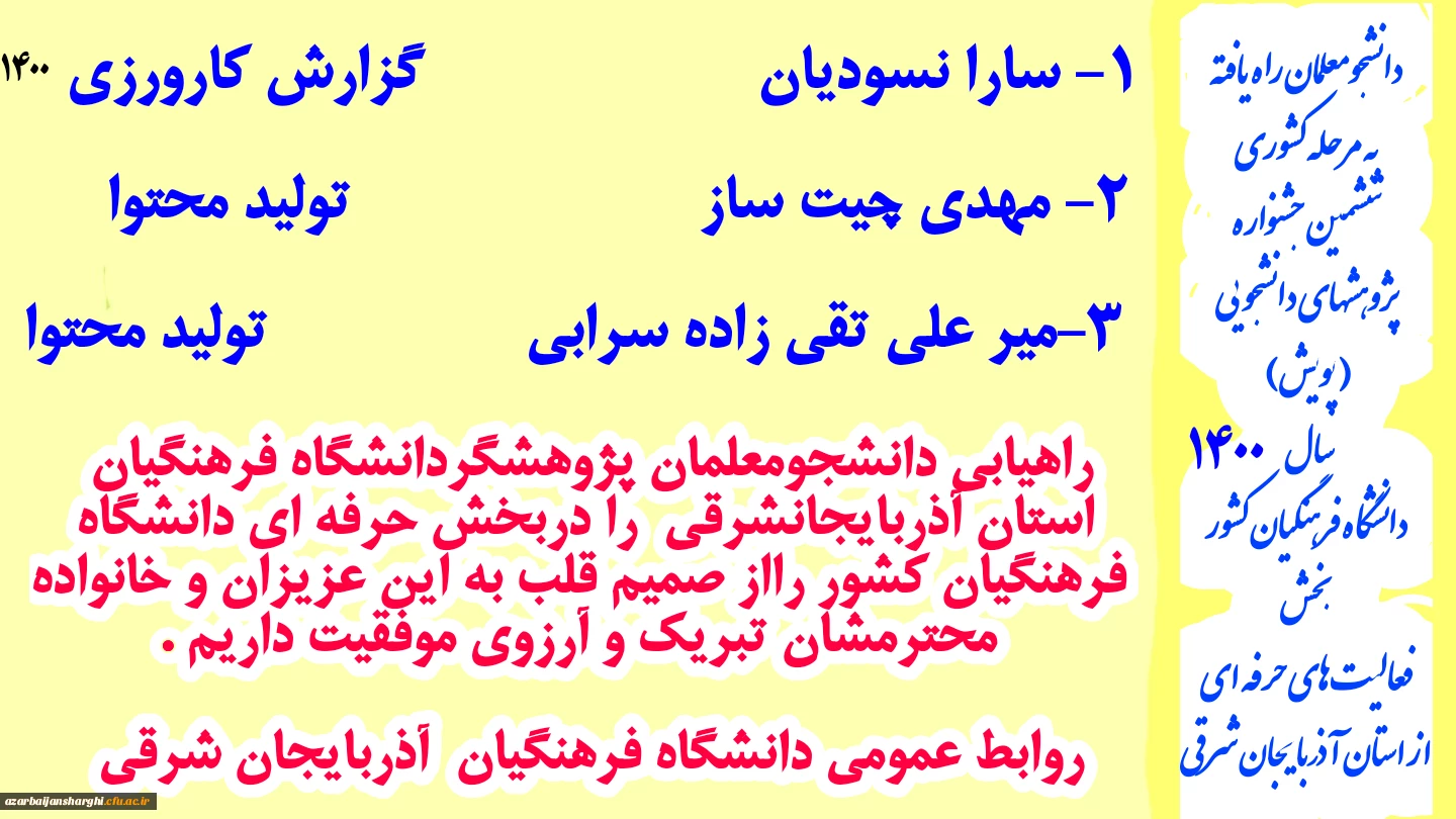 امتیاز دهید : موفقیت و راهیابی دانشجومعلمان دانشگاه فرهنگیان در ششمین جشنواره پویش کشور 3 شنبه 20 آذر 1400 ساعت 1:02