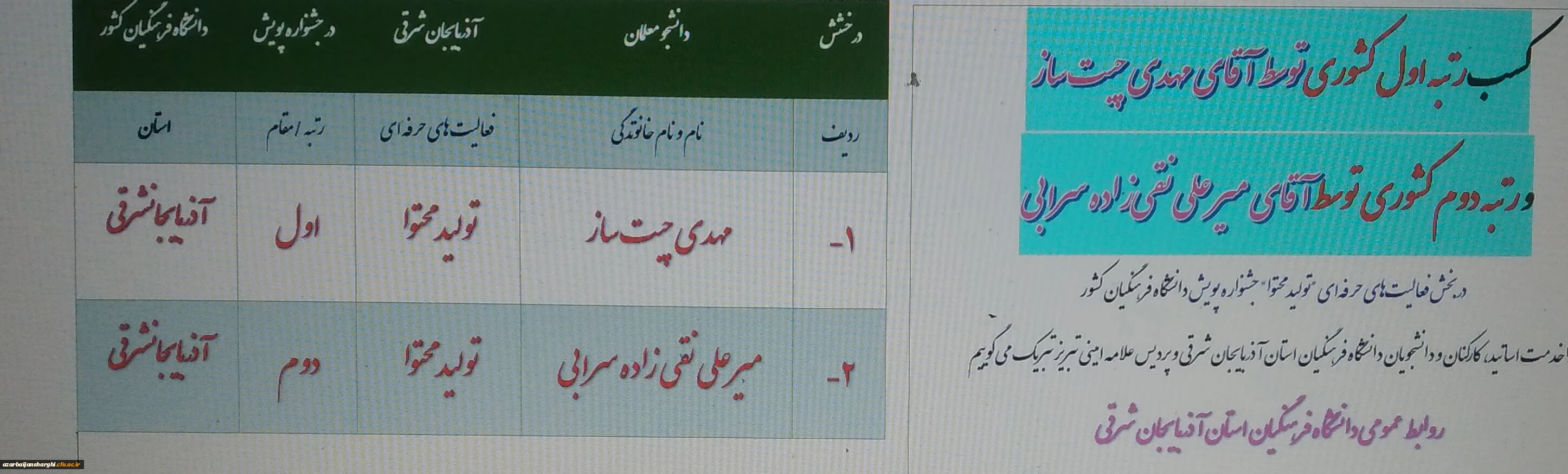 کسب عناوین برتر دانشجو معلمان آذربایجان شرقی در بخش فعالیت های حرفه ای "تولید محتوا" جشنواره پویش دانشگاه فرهنگیان کشور 2