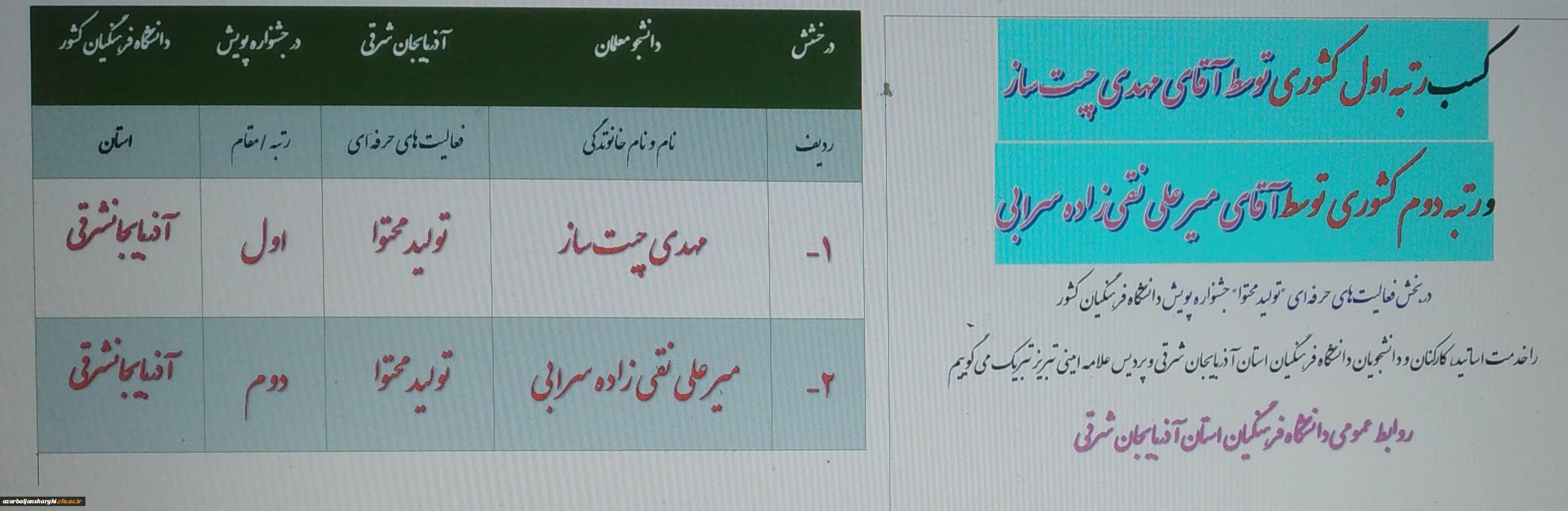 کسب عناوین برتر دانشجو معلمان آذربایجان شرقی در بخش فعالیت های حرفه ای "تولید محتوا" جشنواره پویش دانشگاه فرهنگیان کشور 3
