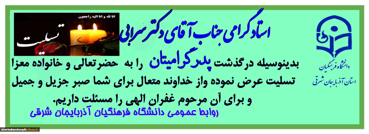 امتیاز دهید : عرض تسلیت به دکتر سرابی در پی درگذشت پدر مهربان و گرامی شان 3 یکشنبه 15 اسفند 1400 ساعت 3:39