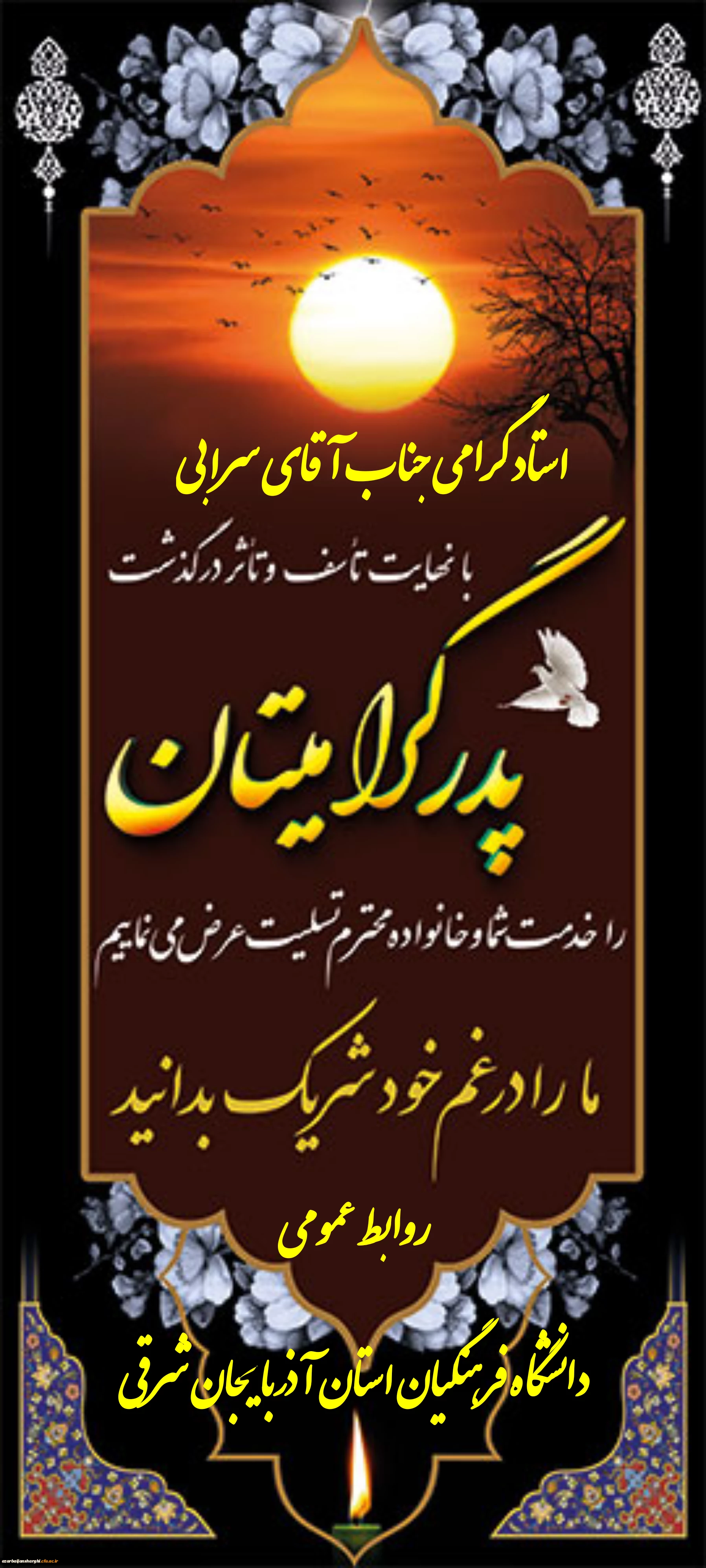 امتیاز دهید : عرض تسلیت به دکتر سرابی در پی درگذشت پدر مهربان و گرامی شان 4 یکشنبه 15 اسفند 1400 ساعت 3:39