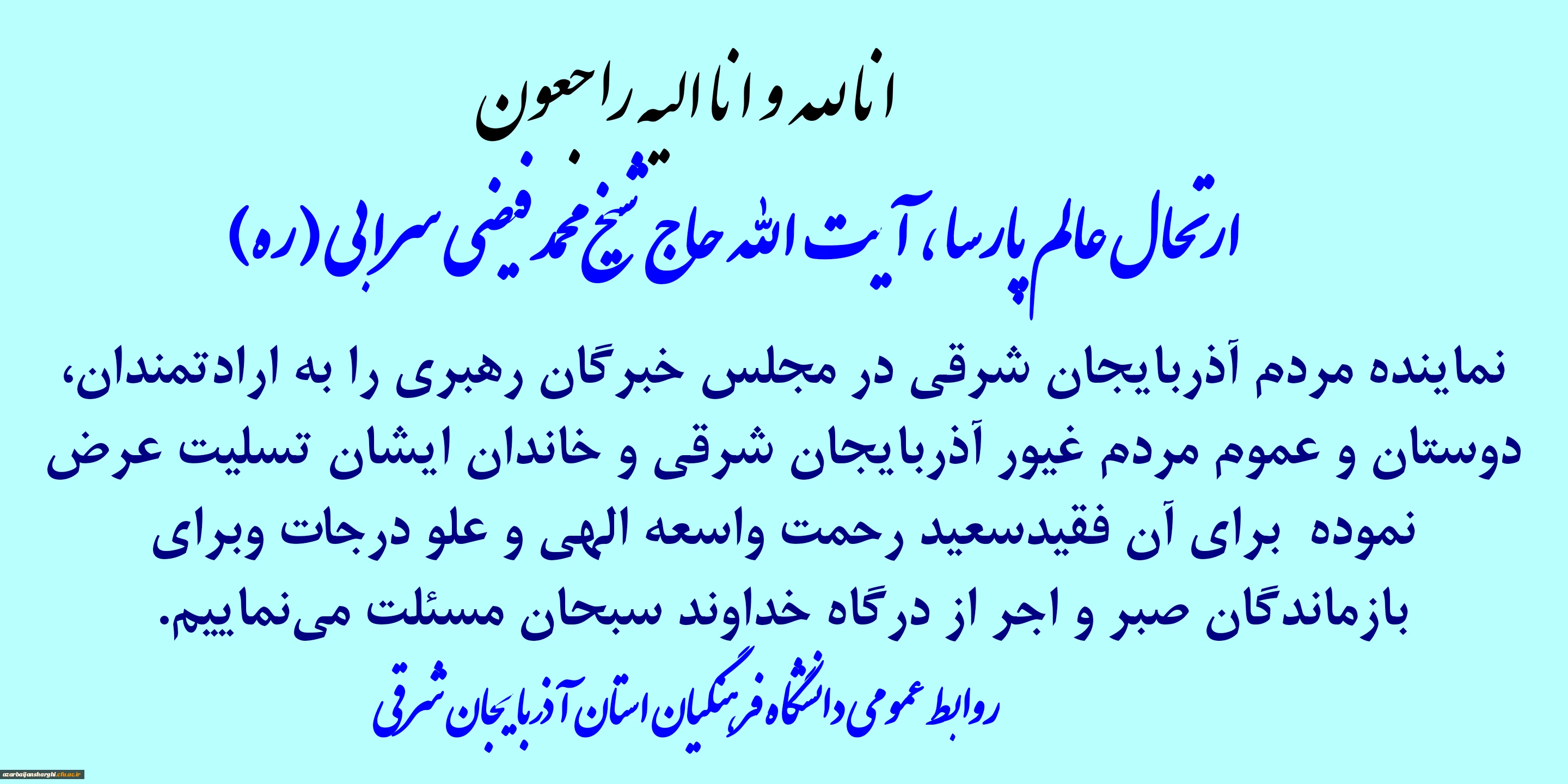 امتیاز دهید : عرض تسلیت در پی رحلت عالم پارسا آیت الله حاج شیخ محمد فیضی سرابی 3 دوشنبه 22 فروردین 1401 ساعت 11:48