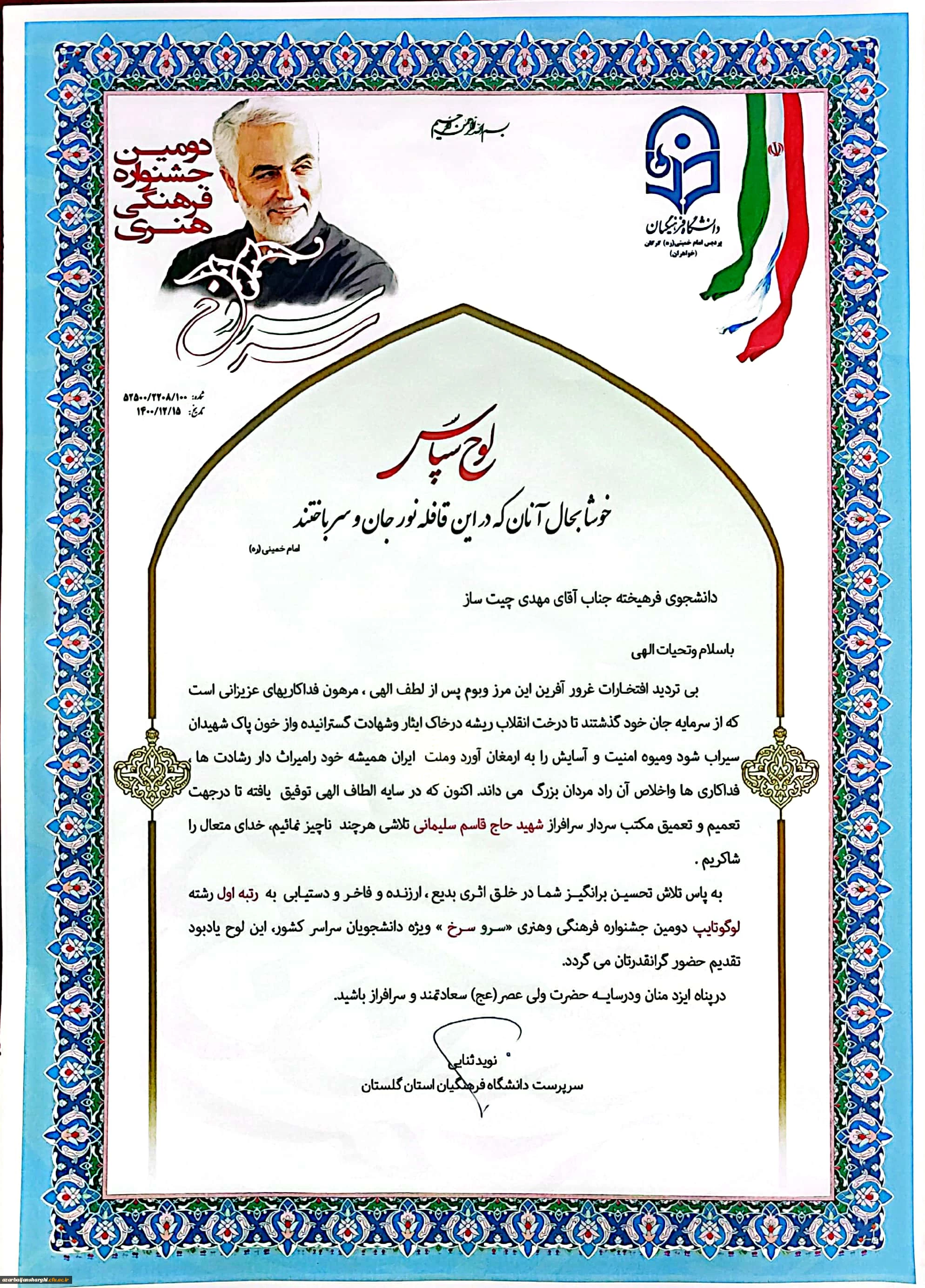 آفتخار آفرینی دانشجو معلم دانشگاه فرهنگیان آذربایجان شرقی در دومین جشنواره فرهنگی هنری سرو سرخ 2
