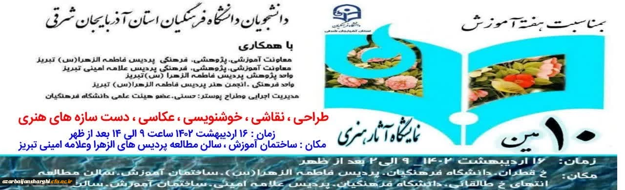 امتیاز دهید : دهمین نمایشگاه آثار هنری دانشجویان دانشگاه فرهنگیان آذربایجان شرقی 3 دوشنبه 4 اردیبهشت 1402 ساعت 11:24
