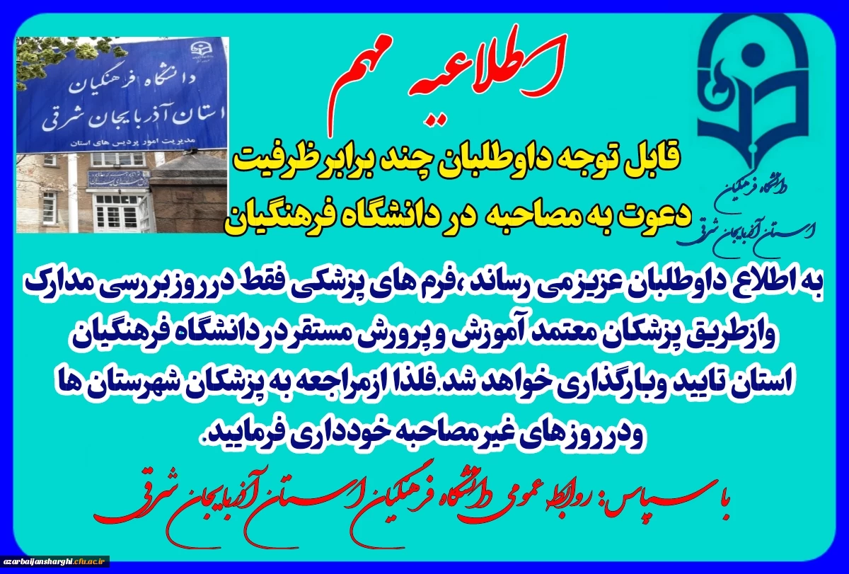 امتیاز دهید : قابل توجه داوطلبان چند برابر ظرفیت دعوت به مصاحبه دانشگاه فرهنگیان 4 پنجشنبه 7 تیر 1403 ساعت 12:07