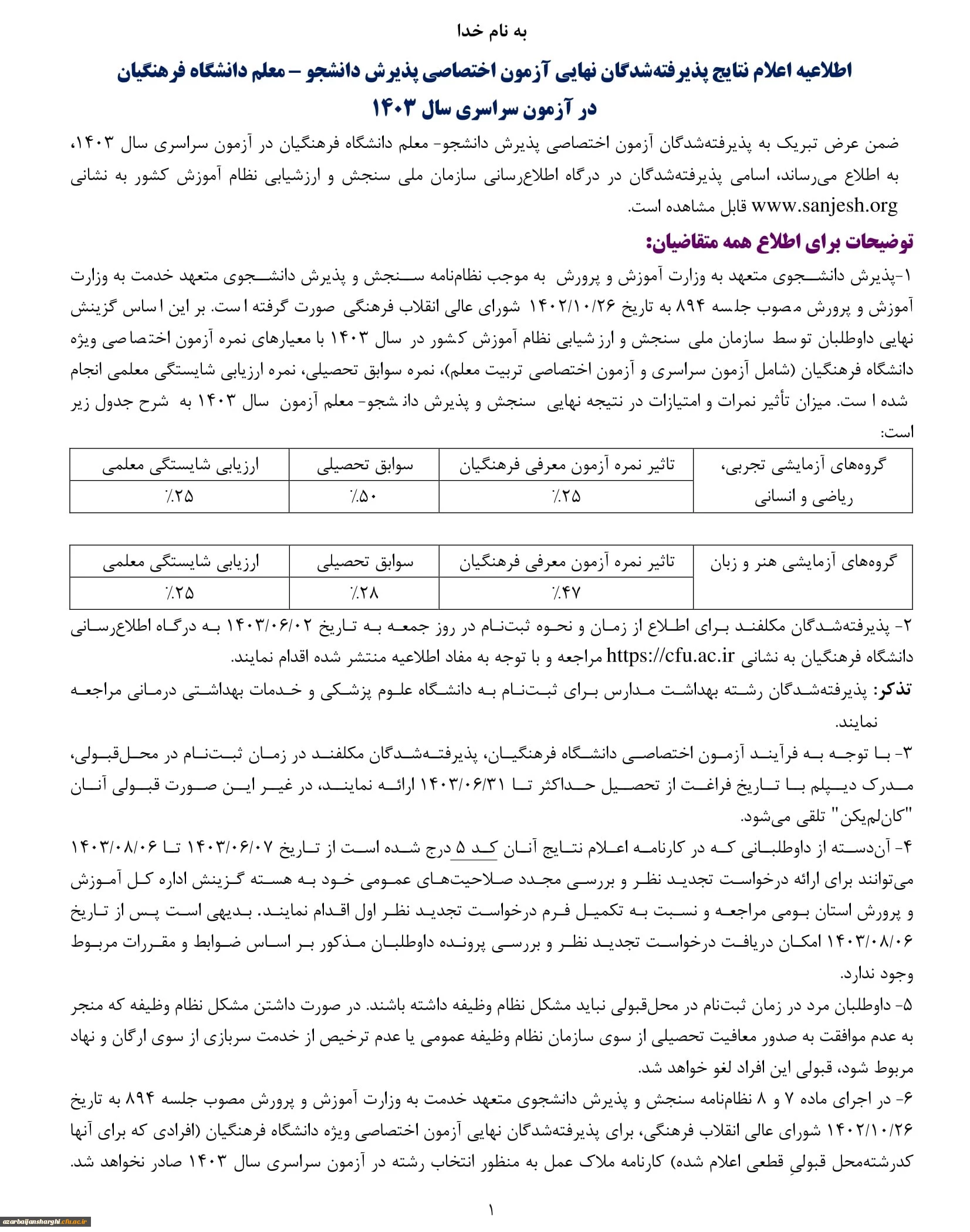 اعلام نتایج پذیرفته شدگان نهایی آزمون اختصاصی پذیرش دانشجومعلم دانشگاه فرهنگیان در آزمون سراسری سال ۱۴۰۳ 5