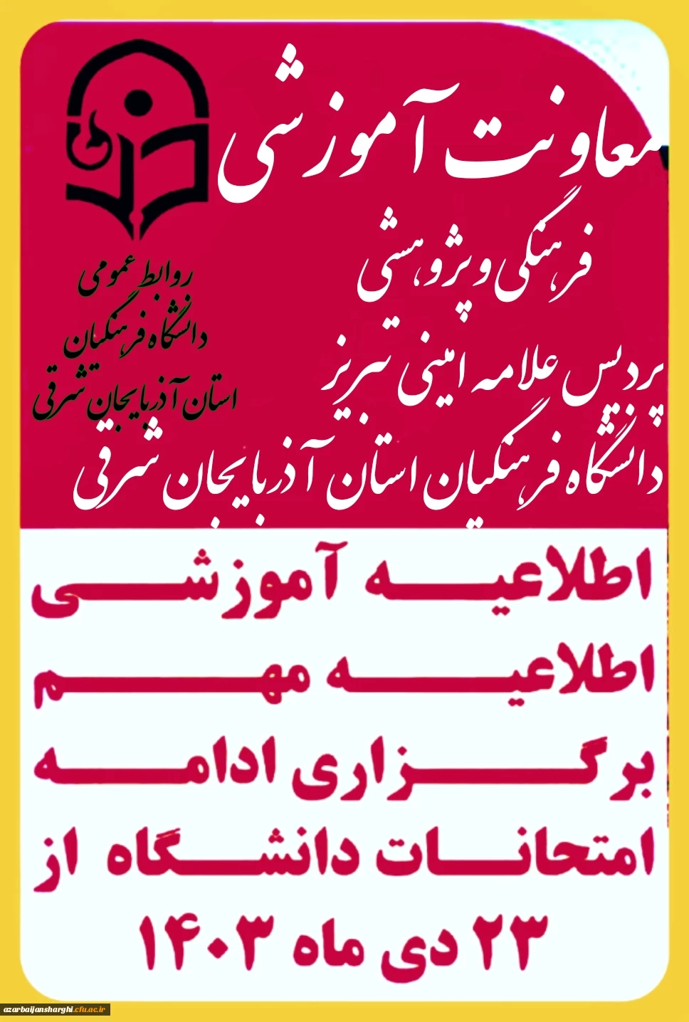 امتیاز دهید : اطلاعیه آموزشی برگزاری ادامه امتحانات دانشگاه فرهنگیان آذربایجان شرقی 5 شنبه 22 دی 1403 ساعت 23:30