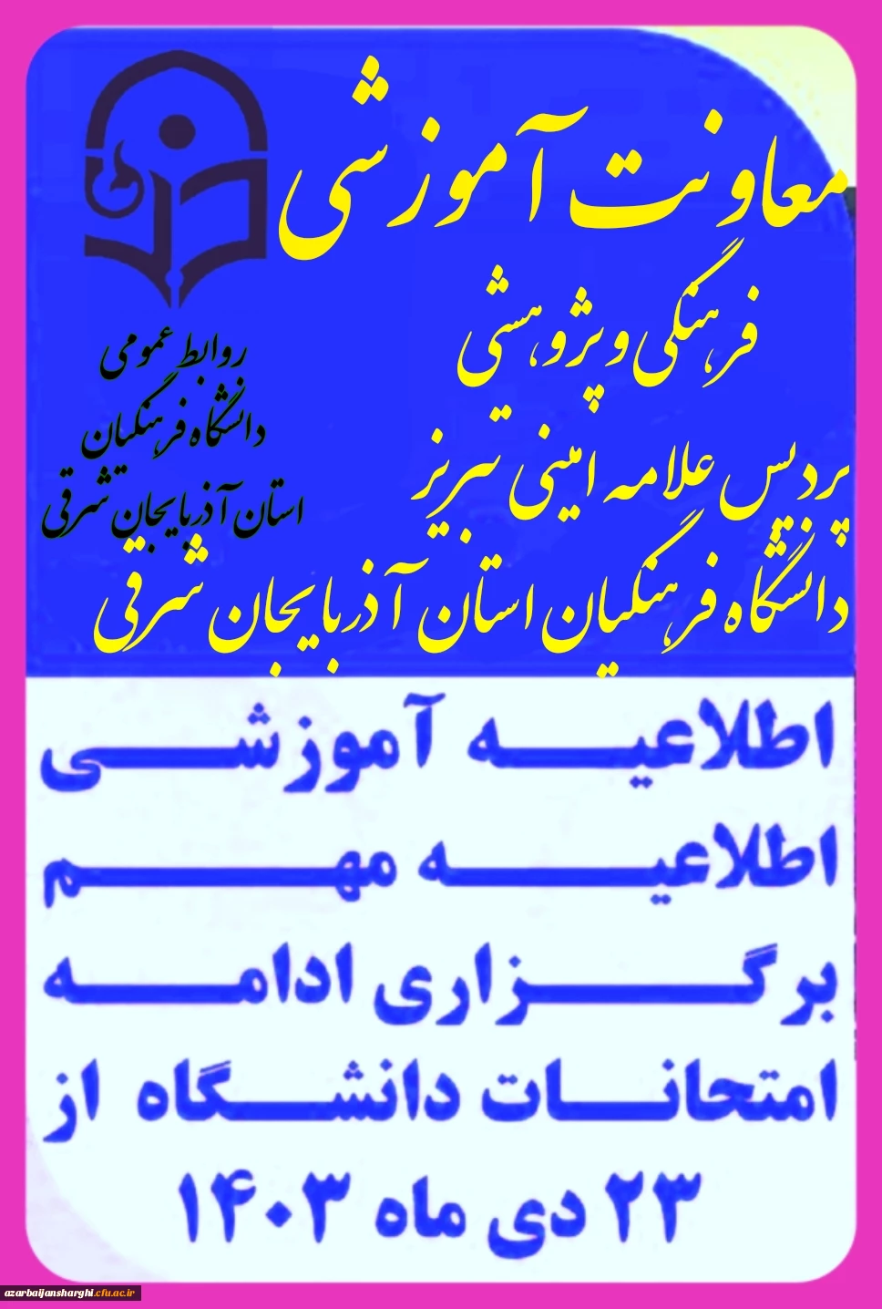 امتیاز دهید : اطلاعیه آموزشی برگزاری ادامه امتحانات دانشگاه فرهنگیان آذربایجان شرقی 7 شنبه 22 دی 1403 ساعت 23:30